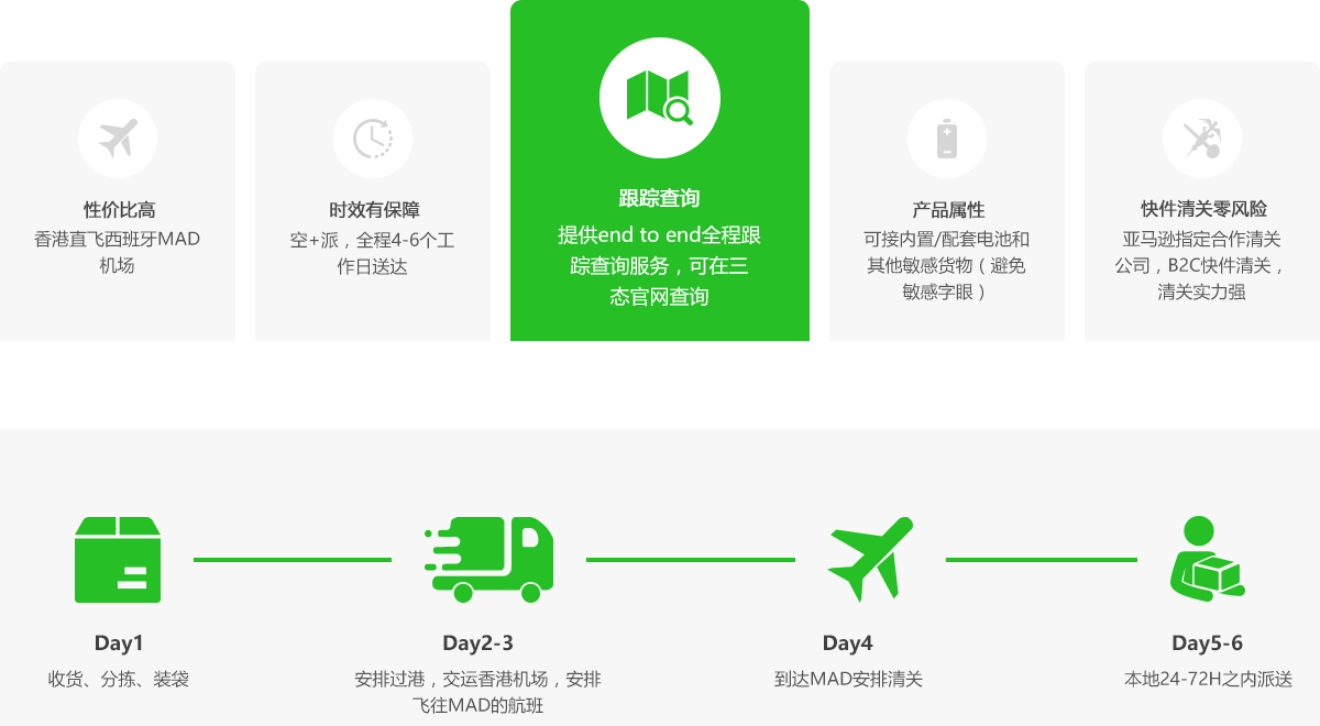 西班牙专线是毕业物流整合空运和西班牙当地快递资源开发的直飞派送至西班牙的服务。属于针对销往西班牙货物推出的一款可接受带电、妥投率高、时效快捷的优质渠道。头程安排从香港空直飞西班牙,在MAD马德里完成清关后,由本地快递派送到目的地收件人。货物支持全程在SFC官网跟踪查询.可免费提供POD签收及2次免费派送,全区派送无偏远费。